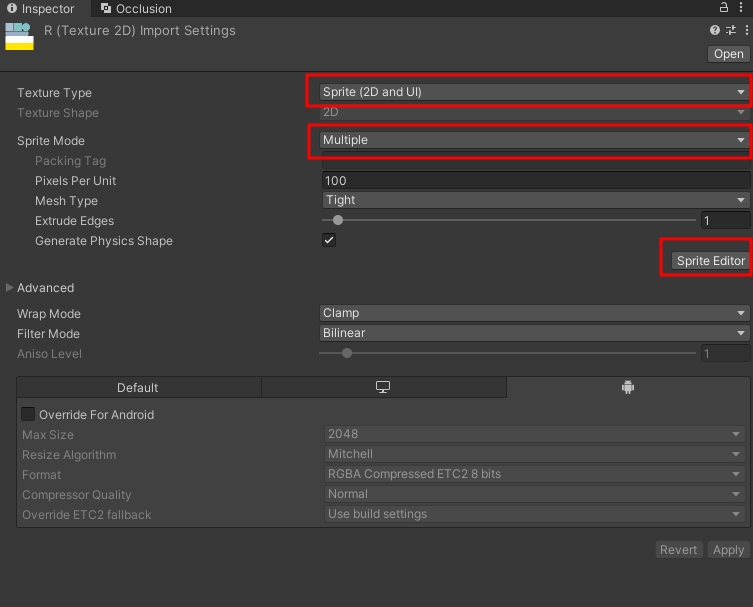 Texture Type을 Sprite으로 변경해주고 Sprite Mode를 Multiple로 변경해줍니다