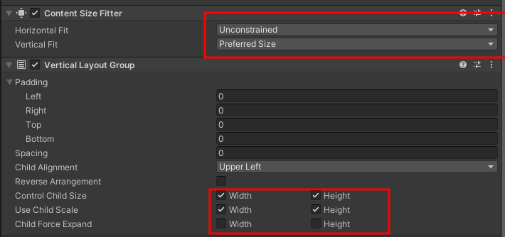 빈 객체에 Horizental Layout Group 컴포넌트를 추가하고 아래와 같이 설정합니다.